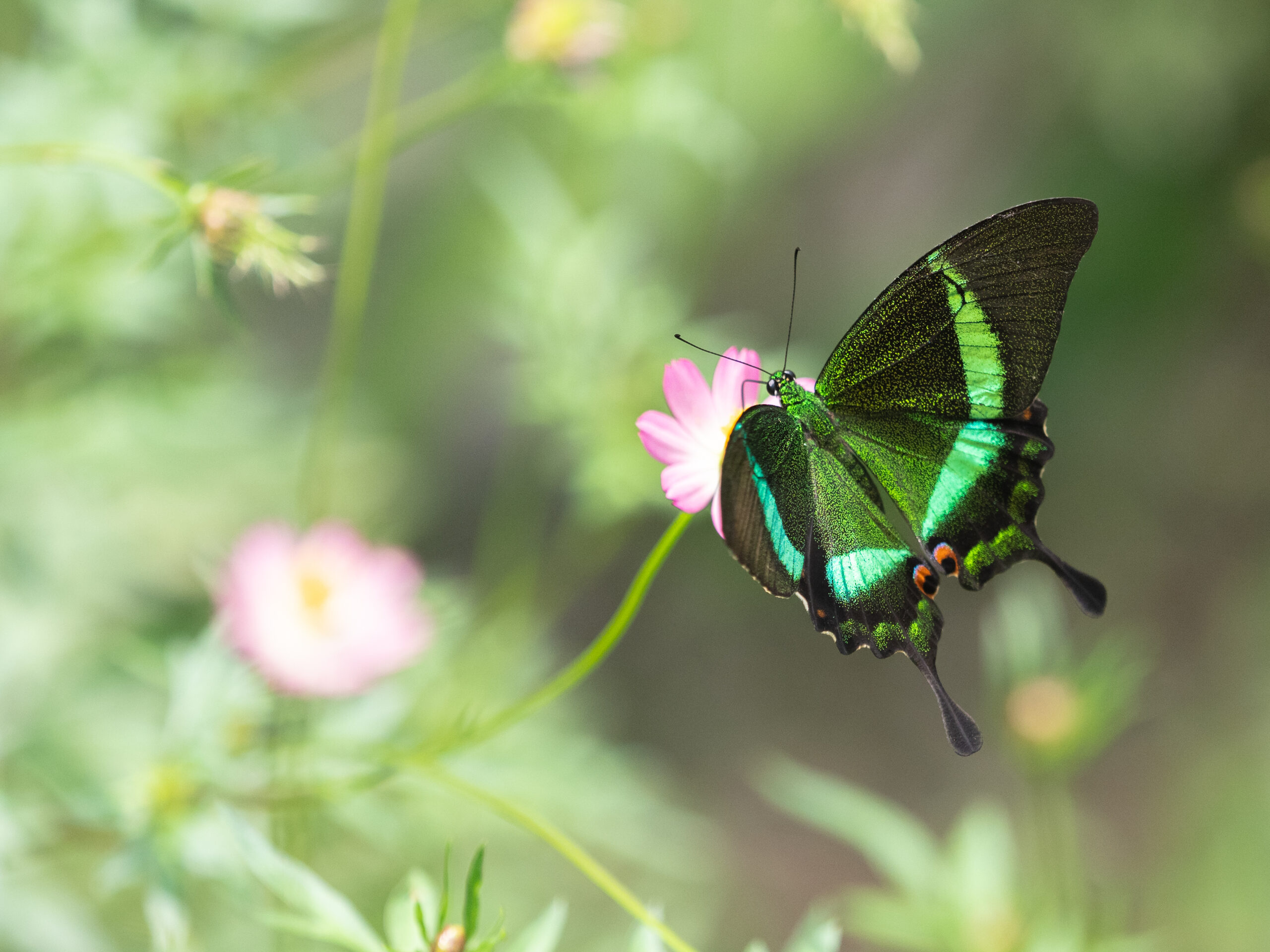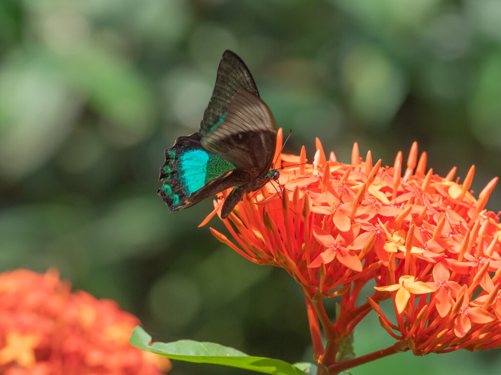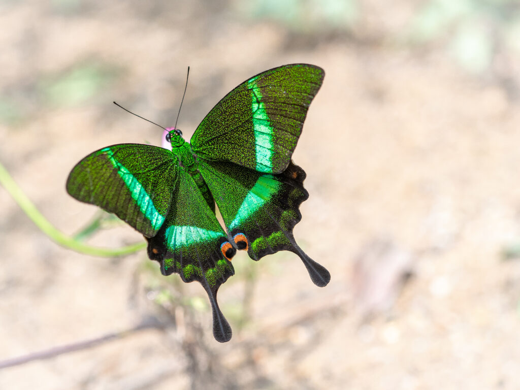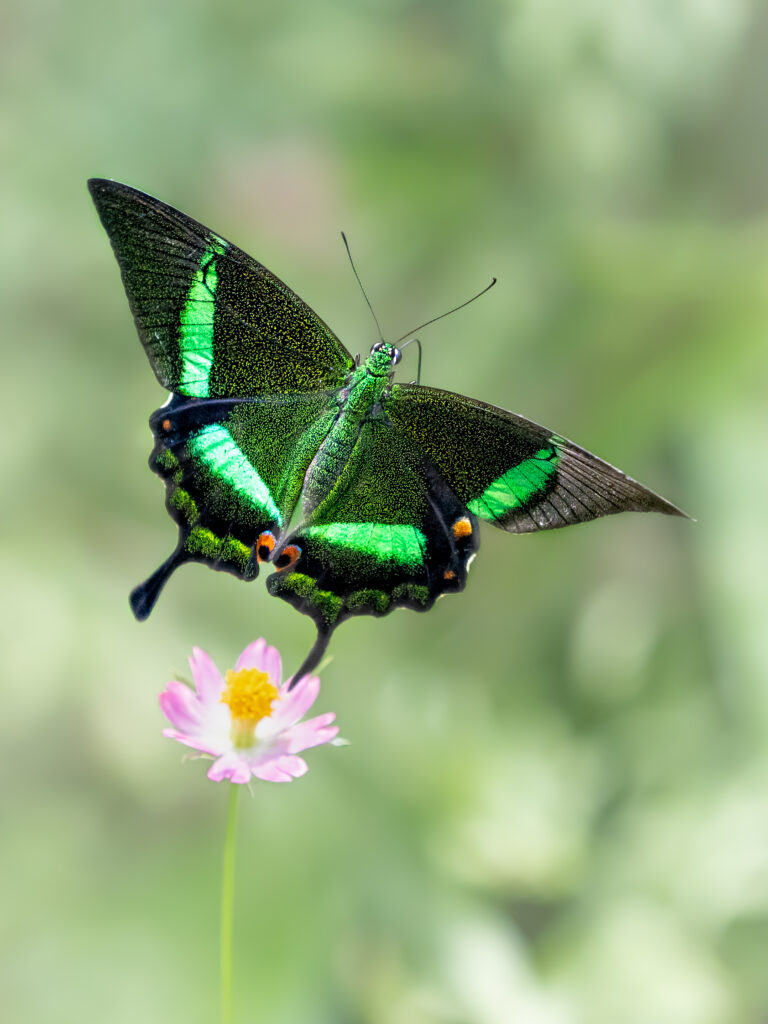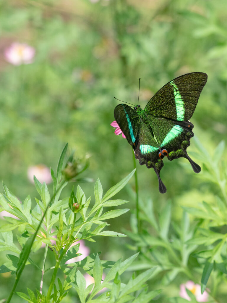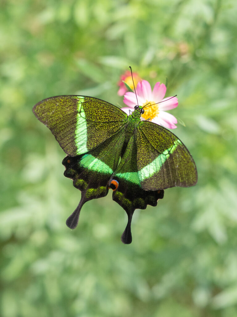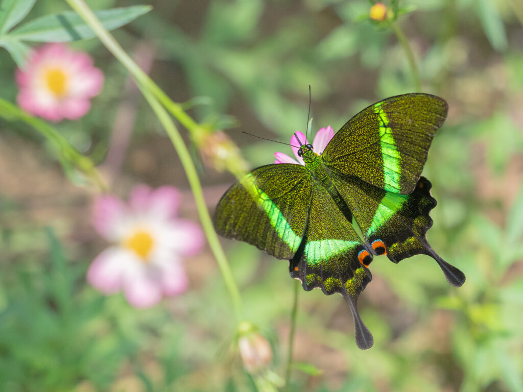 特徴:日本のカラスアゲハに近い仲間で、羽に散りばめられた鱗粉が美しい。