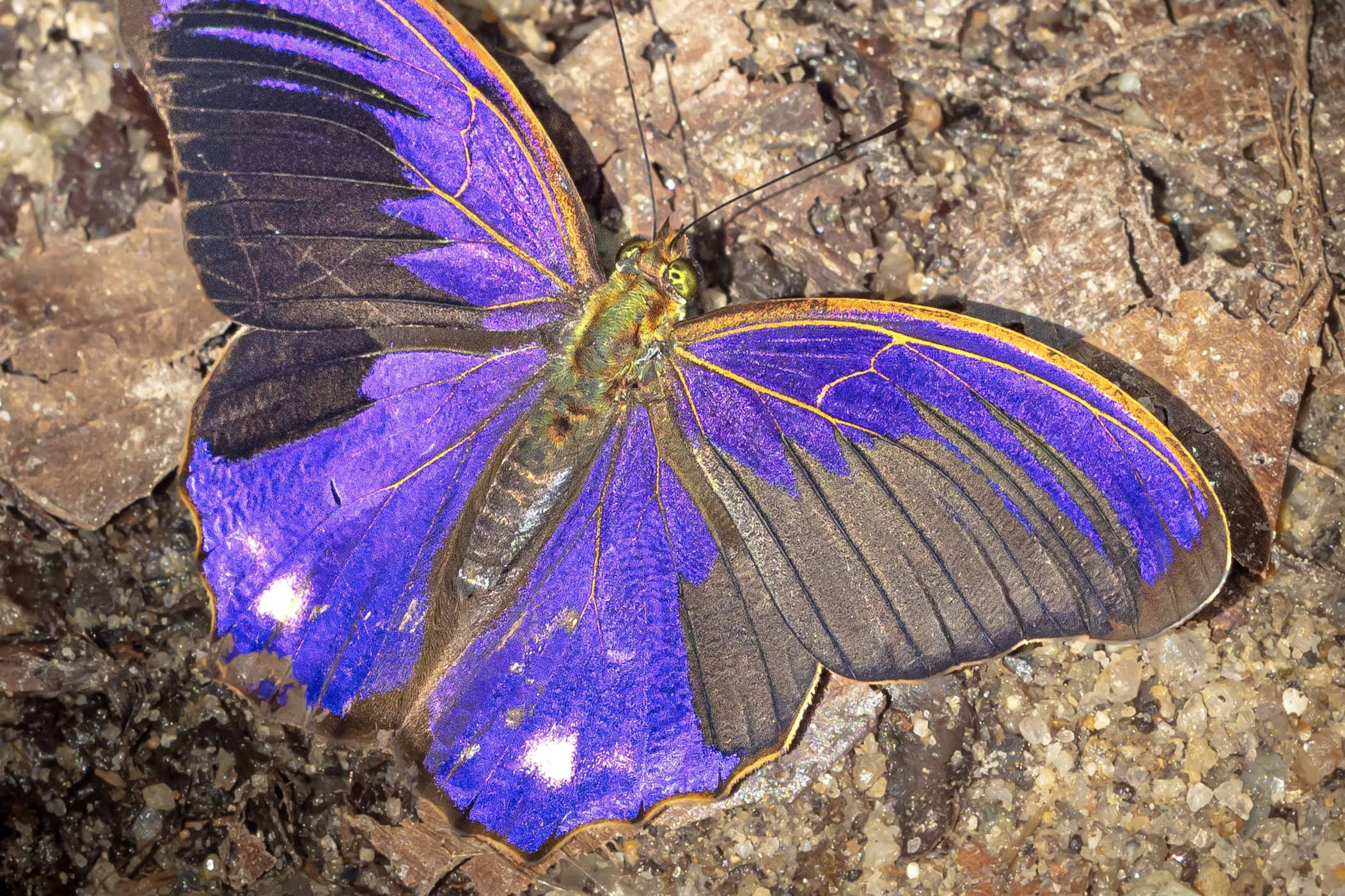 表は凄まじい輝き。裏も衝撃的な模様。ジャングルをゆらゆらと舞う。